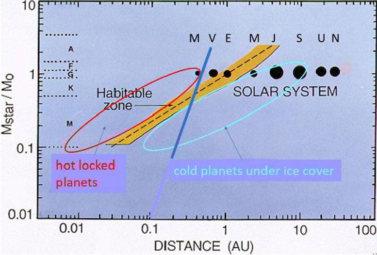 Geleneksel yaşanabilir bölge, çapraz turuncu şerit ile gösterilmiştir. Bu bölgenin ana yıldızdan uzaklığı (yatay eksen, Astronomik Birim cinsinden), yıldızın kütlesi ve dikey eksende gösterilen yıldız türü (M, K, G, vb.) ile artan parlaklıkla birlikte artar. Elipsler, araştırmada sunulan yaşanabilir bölgenin uzantılarını temsil etmektedir.